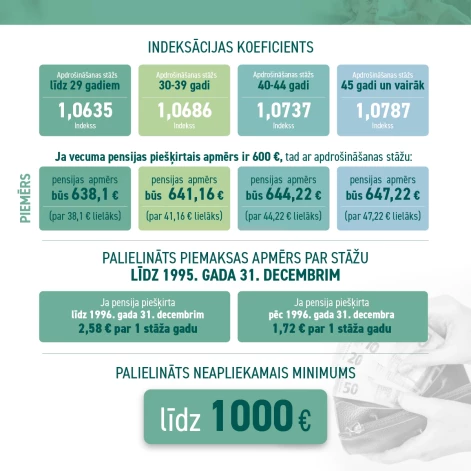Šogad vecuma pensiju indeksācijā tiks piemēroti dažādi indeksi, kas atkarīgi no cilvēka uzkrātā apdrošināšanas stāža. Jo lielāks apdrošināšanas stāžs, jo lielāks indekss tiks piemērots un lielāku vecuma pensijas pieaugumu cilvēks var sagaidīt.