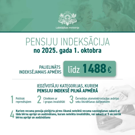 2025. gadā tiks pārskatītas pensijas un atlīdzības vai tās daļas apmērs, kas nepārsniedz 1488 eiro, t.i. iepriekšējā kalendārā gada vidējās apdrošināšanas iemaksu algas valstī apmērā.