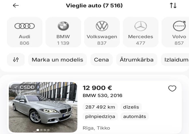 Atverot lietotni, lietotājs uzreiz nonāk aktuālo piedāvājumu plūsmā — no automašīnām līdz nekustamajam īpašumam. Tiem, kuri meklē automašīnu, visam katalogā jau ir vairāk nekā 7 000 sludinājumu no visas Latvijas — sākot no lietotiem auto līdz jaunām automašīnām. Arī nekustamā īpašuma sadaļa tiek aktīvi papildināta — lietotnē pieejami dzīvokļi, mājas un zemes gabali.