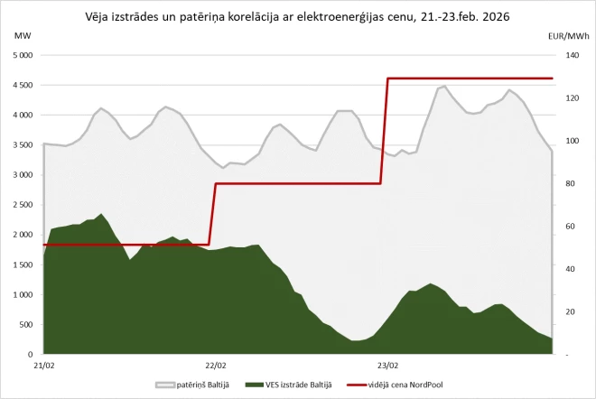 Svarīgi izcelt, ka, lai arī Baltijā Lietuvas vadībā esam palielinājuši savas uzstādītās VES jaudas (Lietuvā no 671 MW 2022.gadā uz 2510 MW 2025.gada beigās[6]), šoziem ar īpaši zemajām gaisa temperatūrām būtiski pieauga arī elektroenerģijas patēriņš. Tas vēl vairāk izceļ jaunu ģenerācijas jaudu uzstādīšanas nepieciešamību.