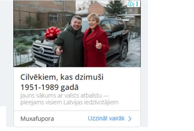 “Cilvēkiem, kas dzimuši 1951-1989. gadā [...] Jauns sākums ar valsts atbalstu – pieejams visiem Latvijas iedzīvotājiem,” teikts vienā šādā neuzticamā reklāmā. Tā aizved uz vēl neuzticamāku vietni.