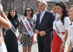 Prezidents Bērziņš pozē kopā ar skaistumkaralienēm. FOTO