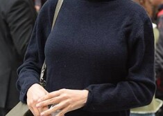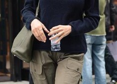 Šādi tērpta, filmas „Kill Bill” zvaigzne devās uz „Louis Vuitton” veikalu Manhetenas rajonā Ņujorkā. Rokās aktrise turēja iPhone tālruni un olīvu krāsas rokassomu, kas bija gandrīz identiskā tonī ar viņas biksēm.