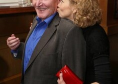 Dita Lūriņa pirmizrādē sirsnīgi sabučo Uldi Dumpi. FOTO