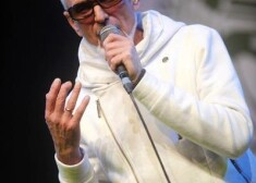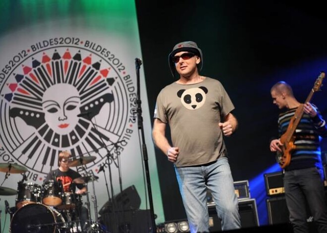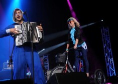 Šomase uz skatuves uzbrauc ar milzu trīsriteni. FOTO