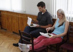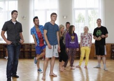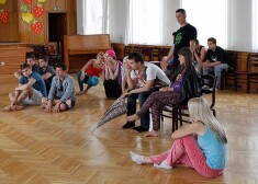 Šova „Okartes skatuve” dalībnieki mūzikla „Dzimuši mūzikai” mēģinājumā