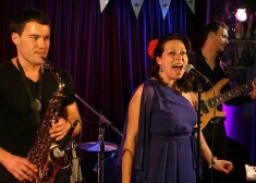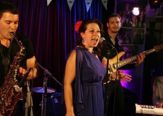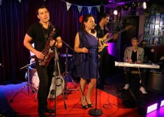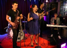 Grupa „Pieneņu vīns”, izpildot džeza dziesmas Rīgā. Vokālistes Evilenas mutē spīd metāla bumbiņa – pīrsings mēlē.