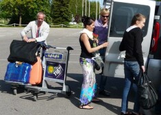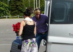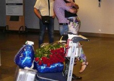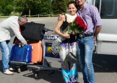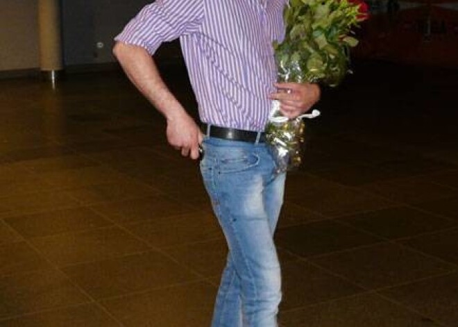 Auzāns draudzeni sagaida lidostā ar rozēm