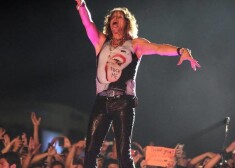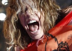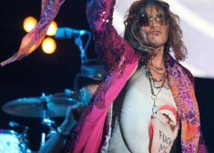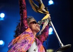 Stīvens Tailers kāpj uz skatuves ar zilu aci. FOTO