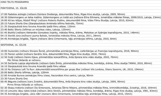 Positivus festivāla kino teltī varēs noskatīties režisora Gata Šmita latviešu kino svaigumu “Seržanta Lapiņa atgriešanās”, Jāņa Streiča kino klasikas pērli “Limuzīns Jāņu nakts krāsā”, Elīnas Eihmanes režisētās īsfilmas par Gūtenmorgenu un jaunās režisores Laumas Balodes īsfilmu “Sterilā zona”. Dokumentālo filmu klāstā būs skatāma Rūdolfa Rubīna filma “Kā Tev klājas, Rūdolf Ming?”, Dzintara Dreiberga “Padoties aizliegts”, Sandra Jūras “Pareizi uzlidot”, Daiņa Kļavas “Dubļi”, kā arī Ivara Zviedra “Bēgums”. Latviešu animāciju pārstāvēs Jāņa Cimermaņa “Animācijas brigāde”, kā arī Arnolda Burova darbu izlase.