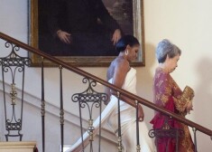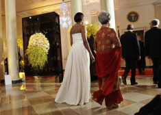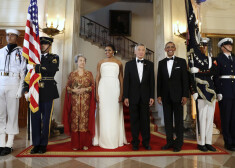 ASV prezidents Baraks Obama (54) ar kundzi Mišelu Obamu (52) otrdienas vakarā rīkoja svinīgo pieņemšanu par godu Singapūras premjerministra vizītei. Sagaidot prominentos viesus, pirmā lēdija bija izvēlējusies ziloņkaula krāsas vakarkleitu bez lencītēm.