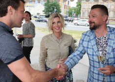 Nu paskat, kādām mīlas dzirksts pilnām acīm Anna Krimele (ex.Lieckalniņa) lūkojas uz savu vīru uzņēmēju Rafaelu Krimelu, kurš tiek iepazīstināts ar „Superbingo” vadītāju Armandu Simsonu (pa labi)!