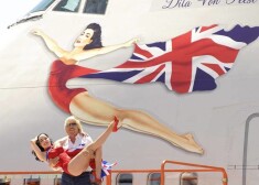 Atzīmējot savas aviokompānijas 10. gadadienu, multimiljonārs Ričards Brensons fotografējas uz lidmašīnas spārna kopā ar rokmūziķa Merilina Mensona bijušo sievu burlesku dejotāju Ditu fon Tīsu.