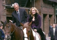 Popzvaigzne pārsteidz skatītājus un zirga mugurā ierodas uz Deivida Letermana TV šovu Ņujorkā.