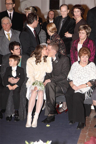 Ziemassvētku priekšvakarā pērn Krimuldas baznīcā viens otram jāvārdu teica aktieri Artūrs Skrastiņš un Ilze Ķuzule. Kamēr kāzu viesi kārtojās kopīgam foto, jaunais pāris izmanto mirkli, lai viens otru tā pa īstam sabučotu. Komentāri lieki – jaunajam pārim rūgts!