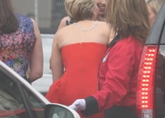 Modes nama „Dior” balto zīda kleitu, kurā viņa apmeklēja filmas pirmizrādi, aktrise bija nomainījusi pret kleitiņu ar ziedu rakstu un ļoti dziļu dekoltē.