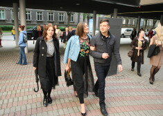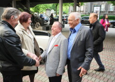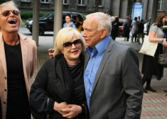 Valdis Zatlers tik noskatās, kā filmas pirmizrādē Jūlijs Krūmiņš skauj viņa sievu