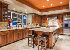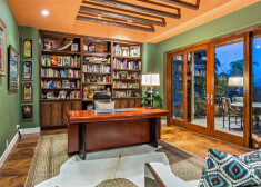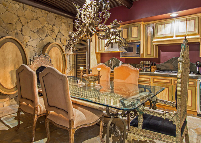 Trīs stāvu lielajā īpašumā ir arī vīna pagrabs, mājas kinoteātris ar bāru un biroja telpa ar slīdošām stikla durvīm, pa kurām iespējams iziet ārā uz terases. Pie mājas ir peldbaseins, kam arhitekti piešķīruši klavieru formu.
