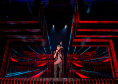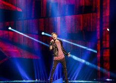 Justs Sirmais vienā no pirmajiem mēģinājumiem uz Eirovīzijas skatuves “Globe” arēnā Stokholmā.