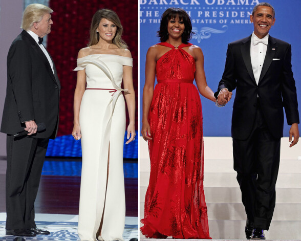 Mišela Obama abās inaugurācijas reizēs bija tērpusies „Jason Wu” kleitās, bet Melānija Trampa izvēlējusies modes nama „Herve Pierre” darinātu kleitu. Runā, ka Trampai grūti bijis atrast kādu dizaineru, kas vēlētos viņai darināt inaugurācijas balles tērpu (pateicoties vīra Donalda Trampa ne pārāk pozitīvajai reputācijai). Savukārt, Mišelas Obamas greznākie tērpi darināti pēc īpaša pasūtījuma un nav novērtējami naudas izteiksmē. Vienas šādas „Versace” kleitas cena varētu sasniegt pat 12 000 ASV dolāru, izvērtējuši modes speciālisti.
