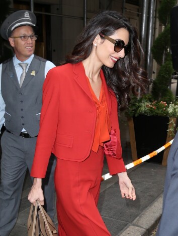 39 gadus vecā advokāte Amala Klūnija bija izvēlējusies ugunīgi sarkanu tērpu: šaurus zīmuļsvārkus un tāda paša auduma īsu žaketīti, zem kuras uzvilkusi siltāk sarkana toņa blūzi ar apjomīgu priekšā sasienamu lentu. Kājās Amala bija apāvusi miesas krāsas laiviņas, kas harmonēja ar viņas rokassomu. Bet acis advokāte bija paslēpusi aiz lielām saulesbrillēm.