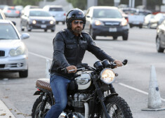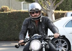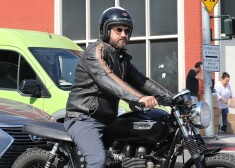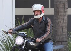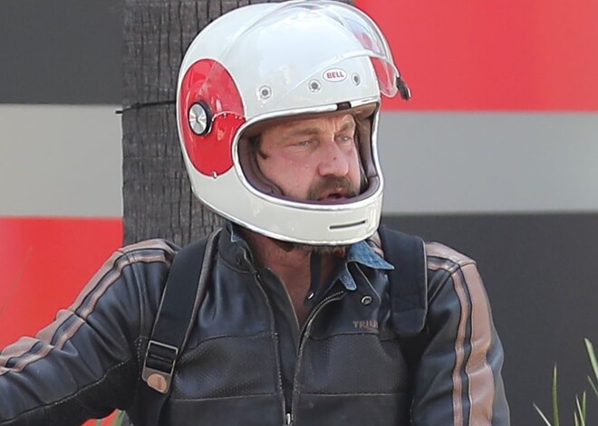 Aktieris Džerards Batlers vizinās ar motociklu.