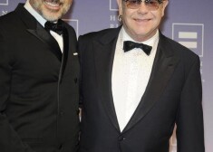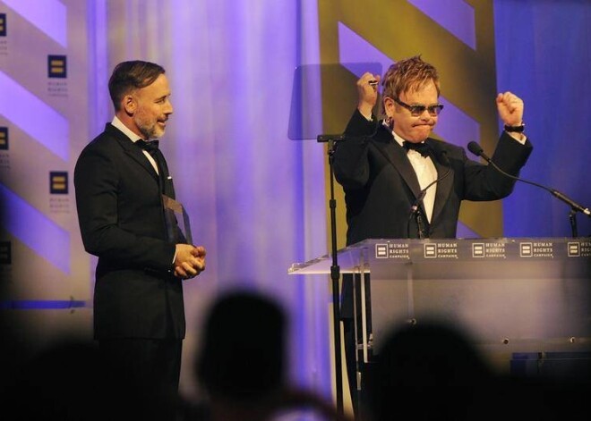 Sers Eltons Džons ar civilpartneri Deividu Fērnišu 18. gadskārtējā Cilvēktiesību kampaņas rīkotajā pasākumā Vašingtonā. Viņi godināti par ieguldīto darbu cīņā ...