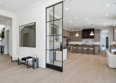Slīdošās durvis ved uz mājas iekšpagalmu, kur ir baseins ar spa zonu, kā arī viesu namiņš.