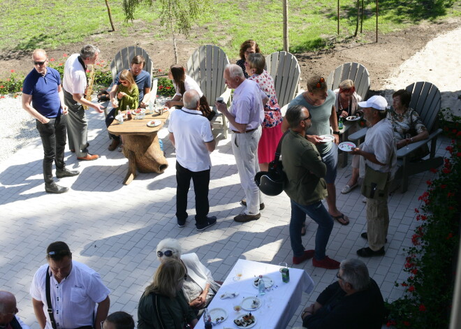 Pēc atklāšanas viesi svinības turpināja Krūmiņa restaurētās Jūrmalas koka mājas iekštelpās un pagalmā, kur pie uzkodām un vīna glāzes risināja nepiespiestas sarunas.
