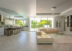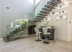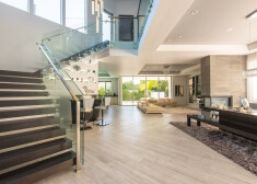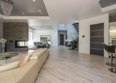 Divu stāvu lielajā namā ir piecas guļamistabas un sešas vannasistabas. Apakšējā stāvā ievērots atvērtais plānojums, apvienojot virtuvi un dzīvojamo istabu. Pie mājas ir baseins ar spa zonu.