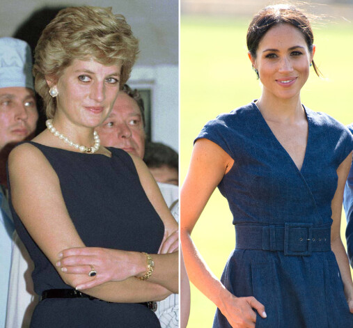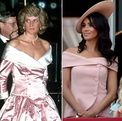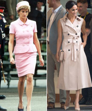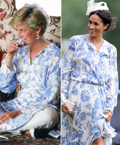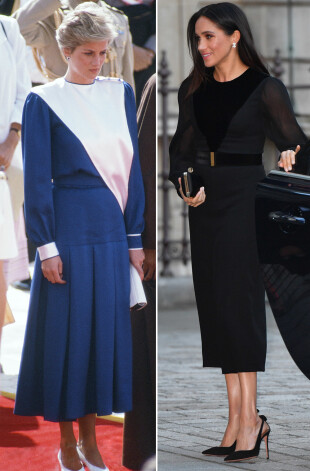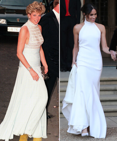 1986. gadā, apmeklējot Saūda Arābiju, princesi Diānu nofotografēja šajā „Catherine Walker” tērpā. Šovasar līdzīga raksta „Oscar de la Renta” kleitā Megana devās līdzi vīram princim Harijam uz viņa drauga kāzām.