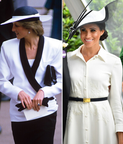 Kā Diāna, tā Megana karaliskajām zirgu skriešanās sacīkstēm Askotā izvēlējušās elegantus melnbaltus tērpus. Pirmo reizi dodoties uz Askotu, Megana bija ģērbusies zīmola „Givenchy” kleitā. Šis modes nams darināja arī Saseksas hercogienes kāzu kleitu.