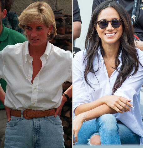 Princese Diāna demonstrē vienu no deviņdesmitajiem gadiem raksturīgajām modes tendencēm – balināta džinsa auduma bikses ar paaugstinātu jostas vietu. Džinsos un baltā kreklā viņa apmeklēja Bosniju. Megana klasisku baltu kreklu ar iemīļotajiem plēstajiem džinsiem izvēlējās, kad pērn kopā ar Hariju apmeklēja „Invictus Games”.