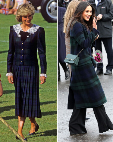 1987. gadā princese Diāna ģērbās rūtaina auduma kleitā ar baltu mežģīņu apkaklīti, kad apmeklēja Kalniešu spēles Skotijā. Megana izvēlējās līdzīga raksta „Burberry” mēteli, kad īsi pēc paziņojuma par saderināšanos kopā ar princi Hariju devās vizītē uz Skotiju.