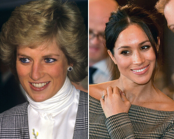 1988. gadā princese Diāna izvēlējās melnbalti rūtaina auduma kostīmu, kad devās uz Padingtona staciju Londonā. Megana līdzīga auduma tērpā apmeklēja Velsu.