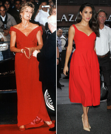 1992. gadā, apmeklējot Džūlijas Voltersas filmas „Just Like a Woman” pirmizrādes vakaru, princese Diāna bija ģērbusies modes nama „Victor Edelstein” sarkana zīda vakarkleitā. Megana līdzīgas krāsas kokteiļkleitu izvēlējās, kad vēl nebija saderināta ar princi un viesojās TV šova „Today” studijā.