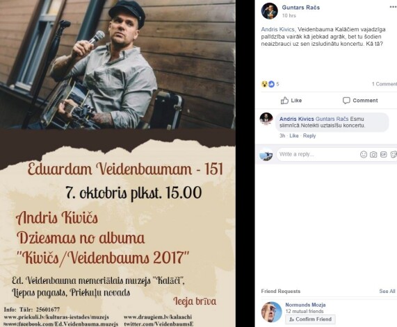 Šī nav pirmā reize, kad fani paliek bez Kiviča un viņa domubiedra Reiņa Briģa koncertprogrammas "Eduardam Veidenbaumam - 151" baudīšanas. Nākamajā dienā pēc 13. Saeimas vēlēšanām Kivičs neieradās uz labdarības koncertu, kas bija rīkots dzejnieka Eduarda Veidenbauma muzeja "Kalāči" atbalstam.