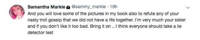 „Un tev patiks dažas no bildēm manā grāmatā. Tās atspēkos visas tavas nejaukās troļļu ziņas par to, ka mums nekad neesot bijusi kopīga dzīve,” raksta Samanta.
