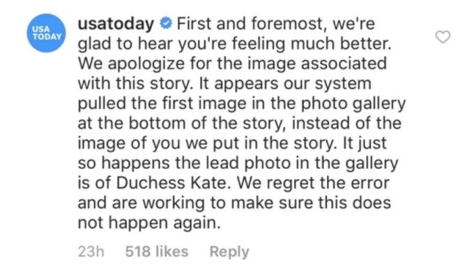 Publikācijas veidotāji apliecinājuši, ka arī priecājas dzirdēt, ka Bekinseila jūtas labāk, un atvainojušies par kļūdaini publicēto fotogrāfiju pie ziņas par aktrises veselību. Viņi paskaidro, ka sistēma automātiski paņēmusi fotogrāfiju no galerijas, kas sekojusi zem šīs ziņas, nevis to fotogrāfiju, ko bija sagatavojuši šim stāstam.