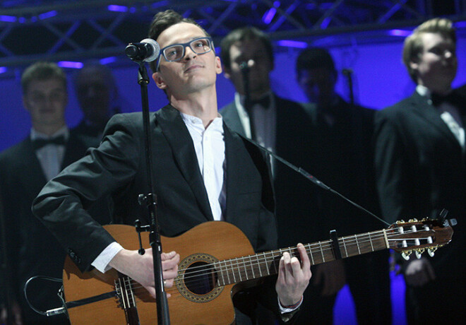 Mūziķi Ventspils Olimpiskajā centrā pošas "Muzikālās bankas 2015" finālkoncertam