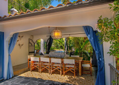 Spāņu stilā celtajā mājā ir 465 kvadrātmetru liela dzīvojamā platība. Ēkā ir trīs guļamistabas un piecas vannasistabas. No plašās ēdamzāles stiklotas durvis ved uz mājas iekšpagalmu, kur iekārtota āra virtuve ar picas krāsni. Savukārt mājā ir plaša baltos toņos ieturēta virtuve ar U formas darba virsmu un vairākām izlietnēm.