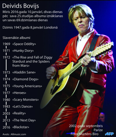 Leģendārais britu mūziķis Deivids Bovijs svētdien 69 gadu vecumā zaudējis cīņā ar vēzi, dziedātāja pārstāvis apstiprināja žurnālam "The Hollywood Reporter".