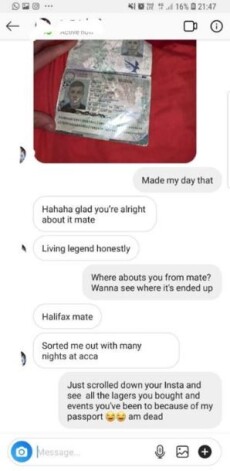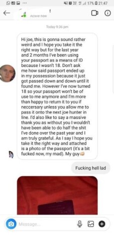 "Sveiks, Džo! Šis noteikti skanēs mazliet dīvaini, bet es ceru, ka tu sapratīsi. Pēdējos 2 gadus un 2 mēnešus es esmu izmantojis tavu pasi kā savu identifikācijas dokumentu, jo man nebija 18 gadu. Nejautā, kā tā nonāca pie manis, jo tā vienkārši ceļoja apkārt līdz atrada mani. Lai nu kā, tagad man ir 18, tāpēc man tā vairs nav vajadzīga. Es varu to atdot tev, ja tev to vēl vajag, ja vien tu neatļausi man nodot to tālāk nākamajam "Džo Hanteram", kurš gaida rindā. Vēl es gribētu tev pateikt lielu paldies, jo bez tevis es nebūtu spējis paveikt daudzas lietas, kuras izdarīju pēdējo gadu laikā. Esmu patiesi pateicīgs. Kā jau teicu, es ceru, ka tu mani sapratīsi," negaidītu ziņu sociālajā vietnē "Facebook" no kāda puiša saņēmis Džo.