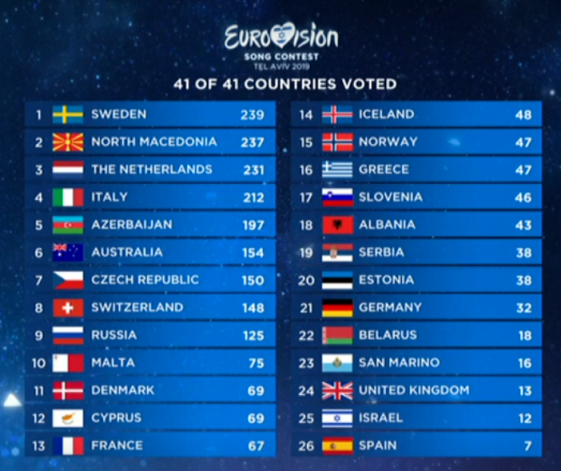 Izraēlas pilsētā Telavivā norit 64.starptautiskā Eirovīzijas dziesmu konkursa fināls. Konkursā kopumā piedalījās 41 valsts, bet finālam kvalificējušās 26 valstis.