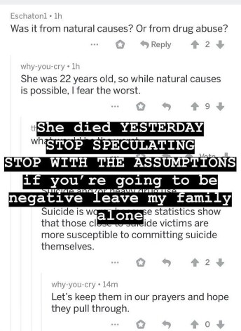 Māsa Aleksandrija vēlāk sociālajos tīklos mudinājusi fanus izbeigt spekulācijas par Gabrielas nāves iemesliem. Viņa publiskojusi ekrānuzņēmumu ar interneta lietotāju komentāriem no „Reddit” slejas, kam pa virsu uzrakstījusi savu viedokli.