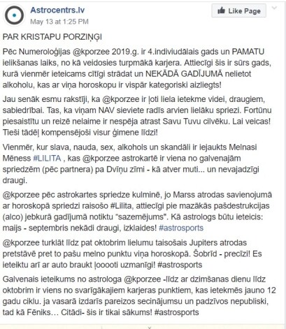 Tā nu astrologi mūsu basketbola zvaigznei ieteiktu no maija līdz septembrim izvairīties no draugiem un izklaidēm, tāpat ļoti uzmanīgi braukt ar auto. „Galvenais ieteikums no astrologa Porziņģim – līdz ar dzimšanas dienu līdz oktobrim ir viens no svarīgākajiem karjeras punktiem, kas ietekmēs jauno 12 gadu ciklu. Ja vasarā izdarīs pareizos secinājumus un padzīvos nepubliski, tad kā Fēnikss…” raksta Baņķis.
