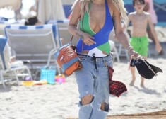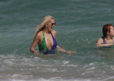 Rita Ora peldkostīmā ar riskanti dziļu dekoltē