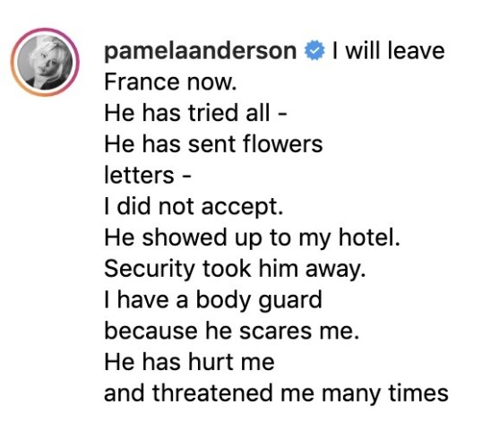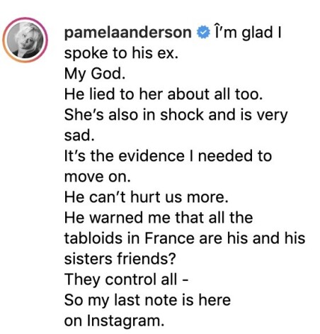 Tagad, kad šīs attiecības ir beigušās, Pamela Andersone plāno doties prom no Francijas. Šos interneta ierakstus viņa veikusi viesnīcā, esot kopā ar miesassargu un kategoriski atsakoties tikties ar Rami (“jo viņš mani biedē”).