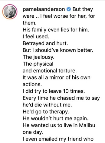 Pamela arīdzan atklāj, ka jau agrāk gribējusi saraut attiecības ar Rami, jo viņš uzvedies kā tirāns, cenšoties visu kontrolēt. Lai gan Andersone vēlējusies aiziet desmitiem reižu, viņam vienmēr izdevies atgūt viņas uzticību.