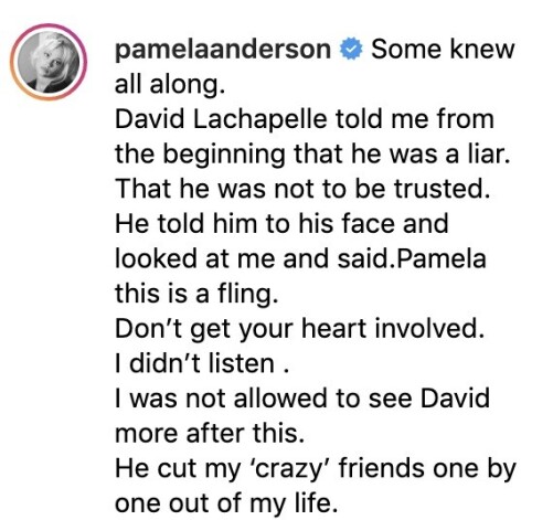 Pamela vaino Rami arī tajā, ka šis vīrietis piespiedis viņu izslēgt no dzīves vairākus svarīgus cilvēkus, ar kuriem viņu vienojusi tuva draudzība, – to skaitā fotogrāfu Deividu Lašapelu. Andersone norāda, ka viņai bijis “liegts satikt Deividu” pēc tam, kad abi vīrieši sastrīdējušies.